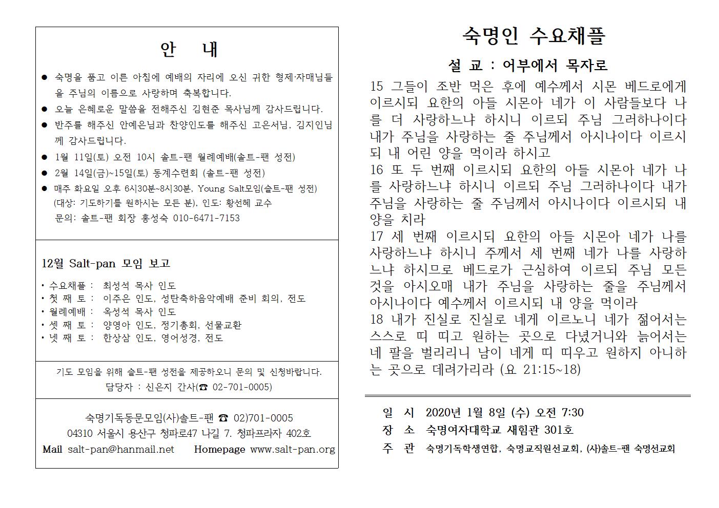 2020년 1월 수요채플 월보입니다.