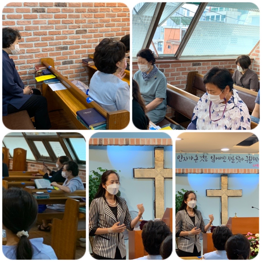 8월 월례예배(8월 생신 정미선,이규희교수님)18대황선혜총장님,20대장윤금총장님 기도하시는모습.