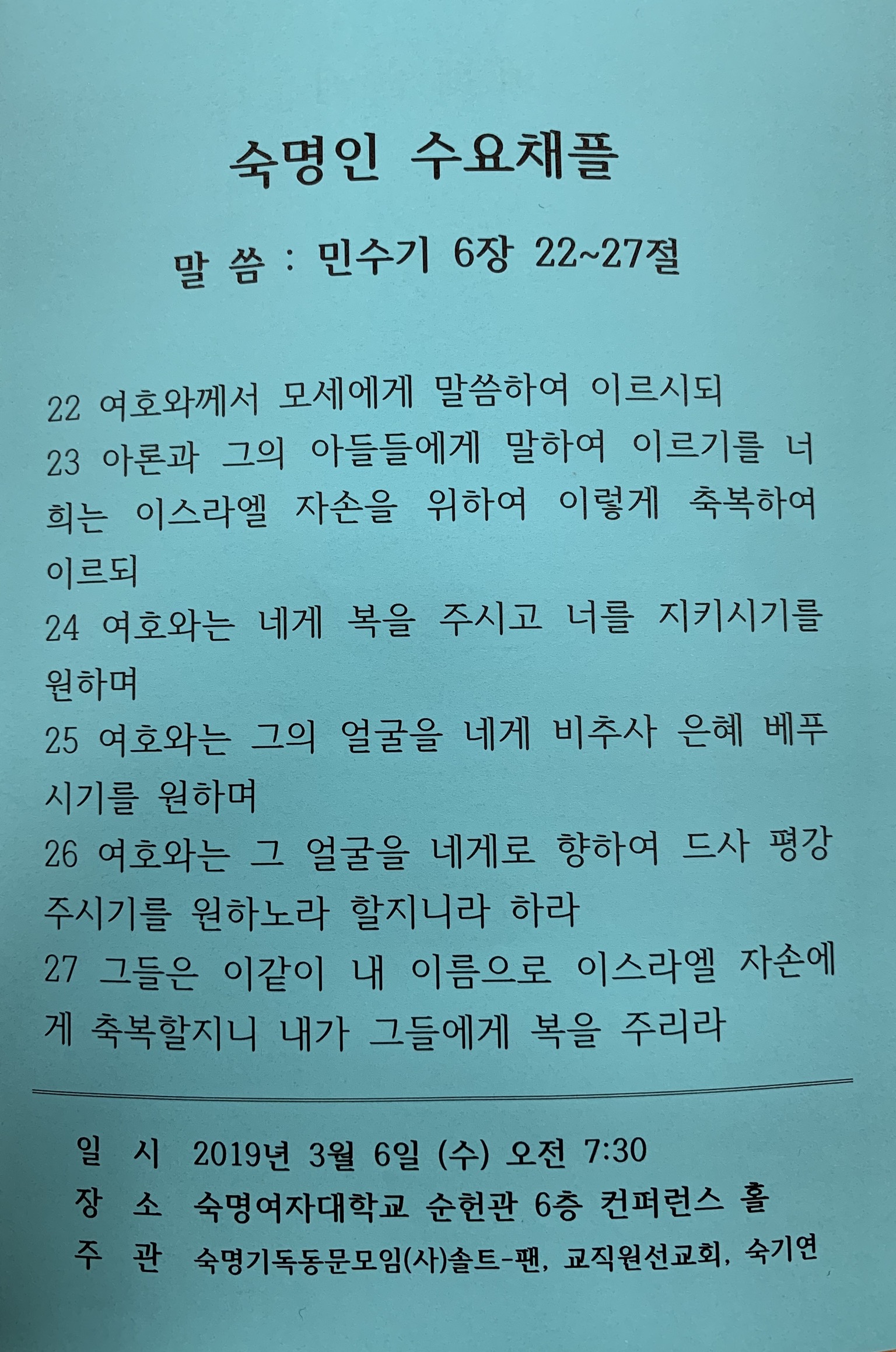 2019년1학기 숙명인예배 일정