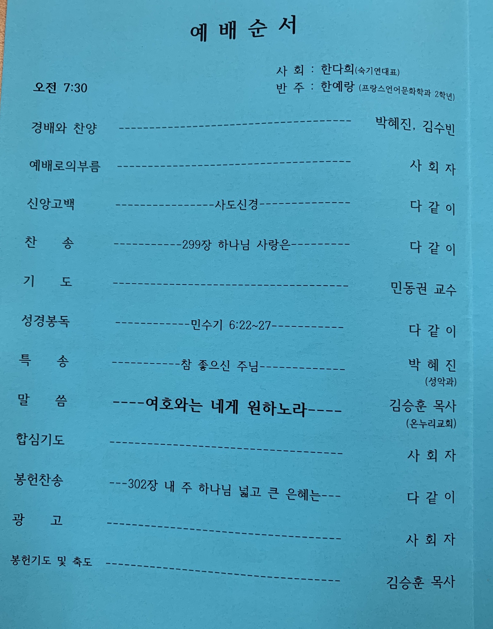 3월 숙명인 수요채플(사회:한다희숙기연대표. 기도:민동권교수님)